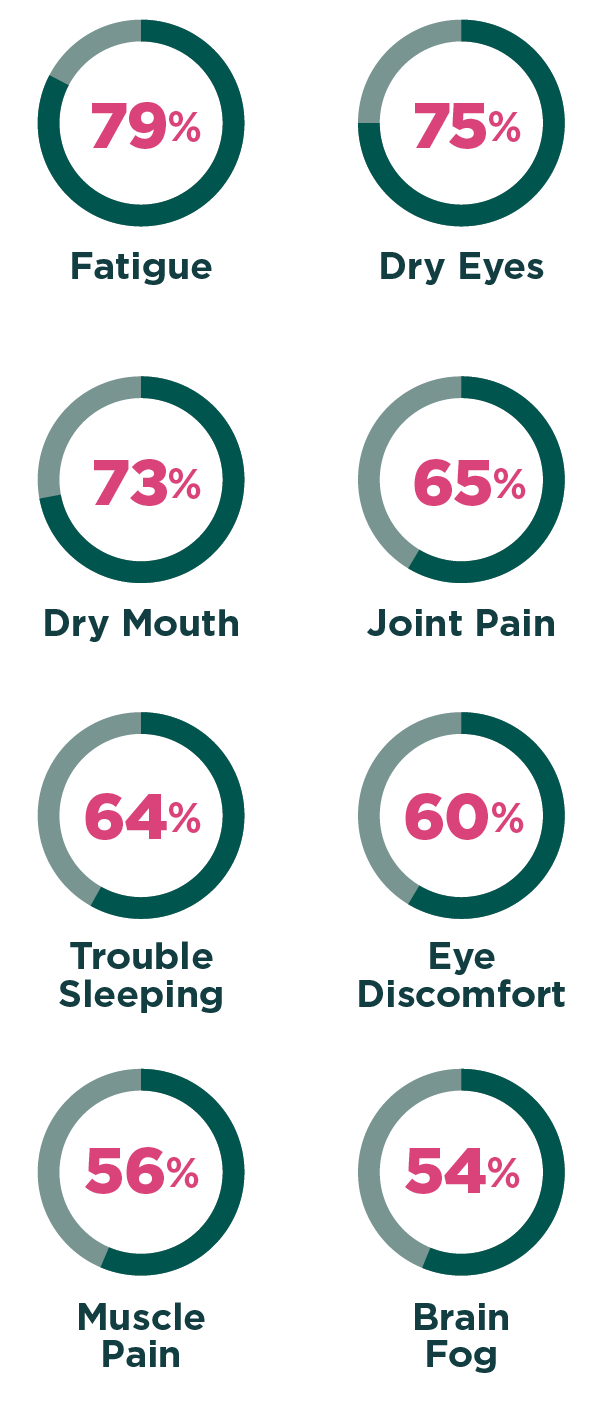 In 2021, The Harris Poll conducted a survey for the Sjogren’s Foundation that included 3,622 U.S. adults diagnosed with the disease.4 Among 48 symptoms experienced by participants, eight had a moderate to major impact on the majority of people.